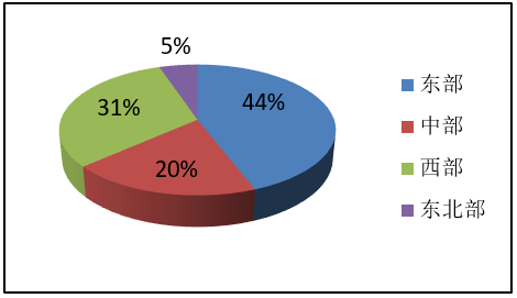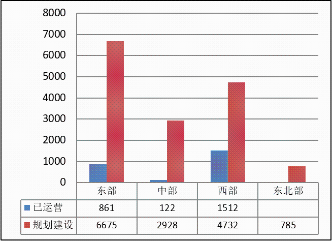 圖2 東、中、西及東北部已運營及規(guī)劃建設(shè)市域(郊)鐵路里程