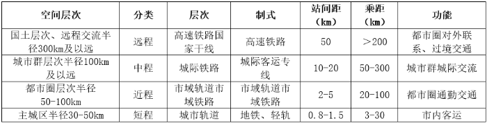我國標準軌距、鋼輪鋼軌型客運軌道交通體系主要由高速鐵路、城際鐵路、市域(郊)鐵路以及普通輪軌型式城市軌道交通構(gòu)成,各類軌道交通有著不同的定位和功能,存在相輔相成的關(guān)系,應(yīng)有一定的層次、合理構(gòu)架,協(xié)調(diào)統(tǒng)一[4]。我國軌道交通體系如表1所示。