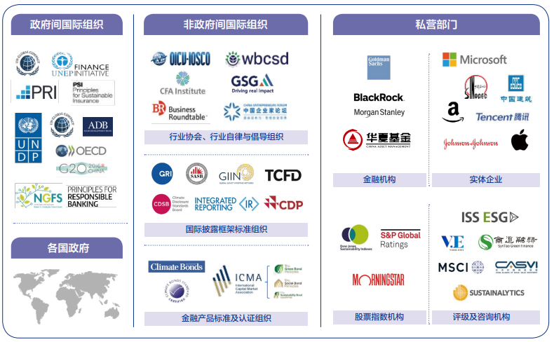 ESG理念和投資原則的迅速傳播和應(yīng)用,關(guān)鍵在于政府間國際組織、非政府間國際組織、公共部門和企業(yè)等多元主體共同參與。聯(lián)合國系統(tǒng)的13家機構(gòu)或倡議組織(包括UNCTAD、ITC、UNDP、UNEP、WBG、IFC、IMF、UN SSE、UNEP FI、PRI、PSI、PRB、UNGC 等),經(jīng)濟合作與發(fā)展組織(OECD)、二十國集團(G20)等重要的國際多邊合作組織,都積極推動ESG政策的制定實行,以亞洲開發(fā)銀行(ADB)為代表的各地區(qū)開發(fā)銀行也紛紛加強對可持續(xù)領(lǐng)域的項目投資力度,推動地區(qū)可持續(xù)發(fā)展目標(biāo)的實現(xiàn)。在各類國際組織、政府監(jiān)管部門、金融機構(gòu)和實體企業(yè)等共同推動下,ESG逐漸走向標(biāo)準(zhǔn)化、國際化、體系化、全面化,成為了國際資本市場的一種“新規(guī)則”。