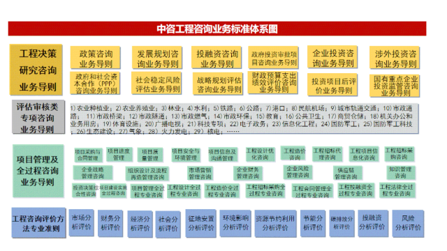 中咨公司工程咨詢業(yè)務(wù)標(biāo)準(zhǔn)體系構(gòu)建的基本內(nèi)容如下圖所示。