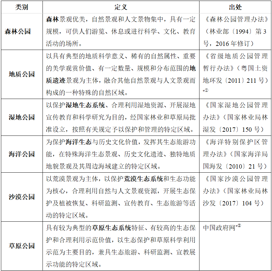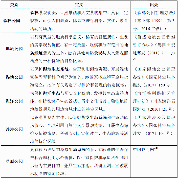 表1 中國主要自然公園定義