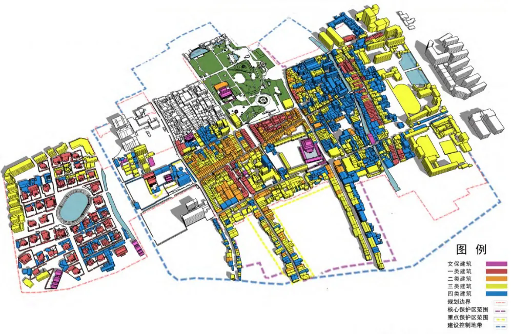 對(duì)現(xiàn)狀歷史建筑的建筑風(fēng)貌、建筑質(zhì)量、歷史意義等因素進(jìn)行評(píng)估,將建筑分為文保建筑、一類建筑、二類建筑、三類建筑、四類建筑五類。其中,文保建筑為極具歷史價(jià)值、意義重大的建筑;一類建筑為風(fēng)貌完好、質(zhì)量上佳的建筑;二類建筑為風(fēng)貌尚可、質(zhì)量稍差的建筑;三類建筑為風(fēng)貌較差、質(zhì)量不佳的建筑;四類建筑為風(fēng)貌極差、質(zhì)量極差的建筑。可以看到,古城中心區(qū)內(nèi)歷史建筑整體保存較好,外圍區(qū)域保存較差,可有針對(duì)性地進(jìn)行建筑風(fēng)貌恢復(fù)、整理工作。