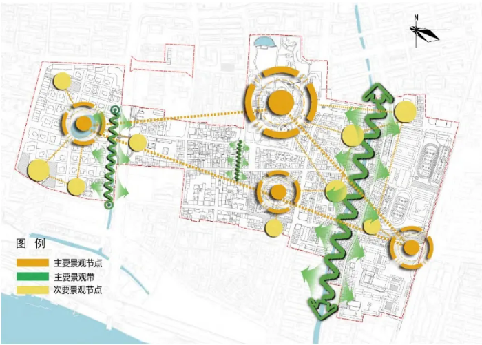 提取宋河在漳州古城歷史演變中的重要組成要素,充分利用宋河水系兩岸景觀及豐富的地?zé)釡厝Y源,亮出宋河沿岸景觀,并通過(guò)打造溫泉體驗(yàn)特色聚集人氣,重現(xiàn)“至誠(chéng)無(wú)息,博厚悠遠(yuǎn)”的宋河古韻。以中山公園、僑村西姑池、文廟等主要景觀要素形成主要景觀節(jié)點(diǎn),結(jié)合街巷空間和開(kāi)放空間形成次要景觀節(jié)點(diǎn),強(qiáng)化宋河兩岸的景觀空間營(yíng)造形成景觀帶,以主帶次、點(diǎn)帶連片,形成相互聯(lián)系、相互滲透的有機(jī)景觀結(jié)構(gòu)系統(tǒng)(圖9)。