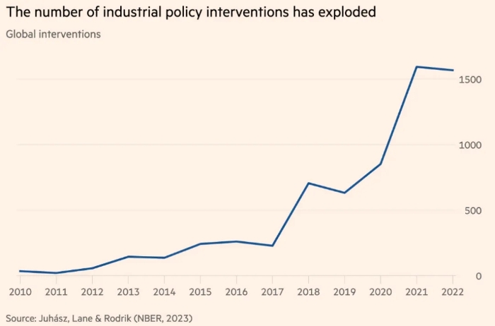 有證據(jù)表明,產(chǎn)業(yè)政策作為一種理念和實踐都變得更加普遍。國際貨幣基金組織去年 1 月發(fā)布的《產(chǎn)業(yè)政策回歸數(shù)據(jù)》顯示,過去十年,商業(yè)媒體中對產(chǎn)業(yè)政策的提及顯著增加。美國國家經(jīng)濟研究局發(fā)表的一篇關(guān)于《產(chǎn)業(yè)政策的新經(jīng)濟學(xué)》的論文由雷卡·尤哈斯、內(nèi)森·萊恩和丹尼·羅德里克共同撰寫,論文顯示,全球產(chǎn)業(yè)政策干預(yù)措施急劇增加,從2017年的228項增加到2022年的1568項——主要是在高收入國家(可能是因為它們有更多的財政空間)。這也讓世界其他國家指責(zé)它們虛偽。(見圖1)